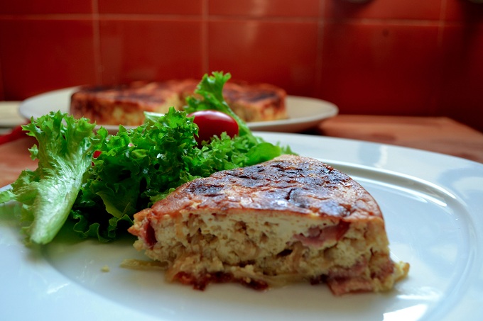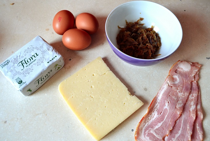 Η quiche αυτή δεν έχει βάση, εξ ου και γυμνή άλλωστε, αυτό όμως δεν την κάνει λιγότερο νόστιμη από τη συνηθισμένη. Για τη γέμιση χρησιμοποίησα τα υλικά της quiche lorraine, δηλαδή τυρί, μπέικον και φυσικά καραμελωμένα κρεμμύδια, όμως εσύ μπορείς να πειραματιστείς χρησιμοποιώντας μανιτάρια, σπανάκι ή ό,τι άλλο υπάρχει στο ψυγείο σου.