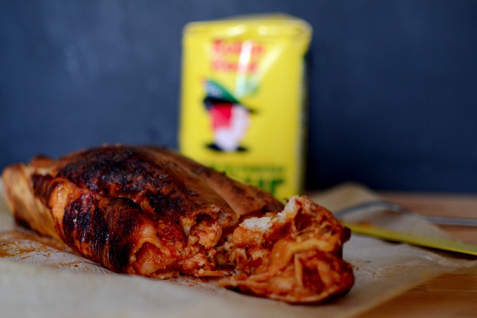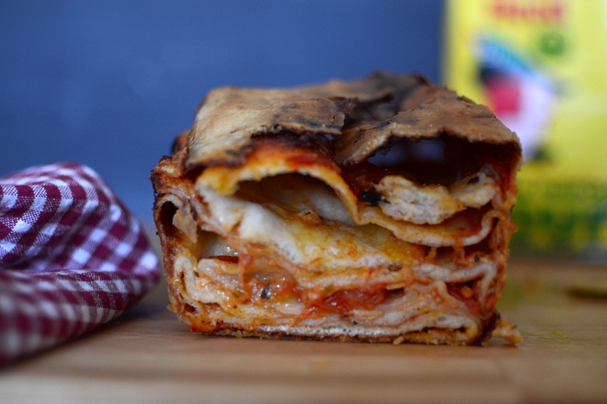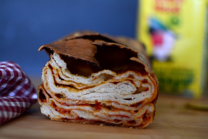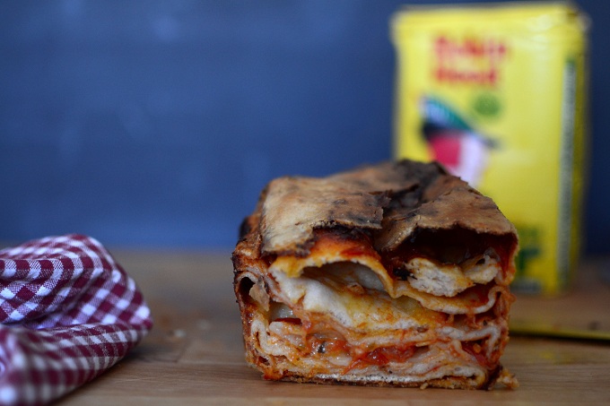 - Ξαναδιπλώνεις το υπόλοιπο 1/3 ώστε να σχηματιστεί ένα παραλληλόγραμο και απλώνεις από πάνω την υπόλοιπη σάλτσα και το υπόλοιπο τυρί